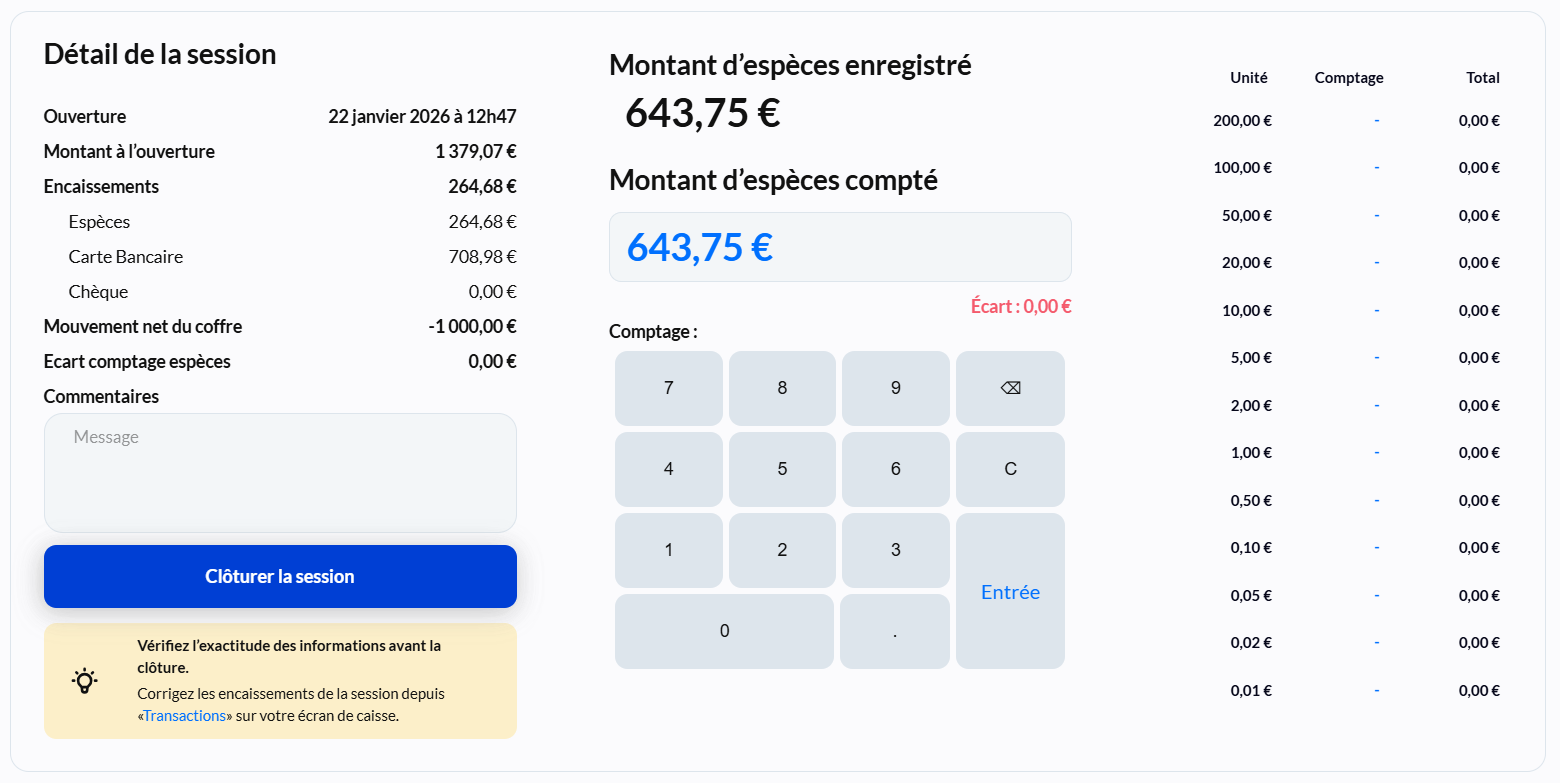 A la suite des encaissements en espèces enregistrés par l'utilisateur pendant la session, le montant théorique s'affiche
